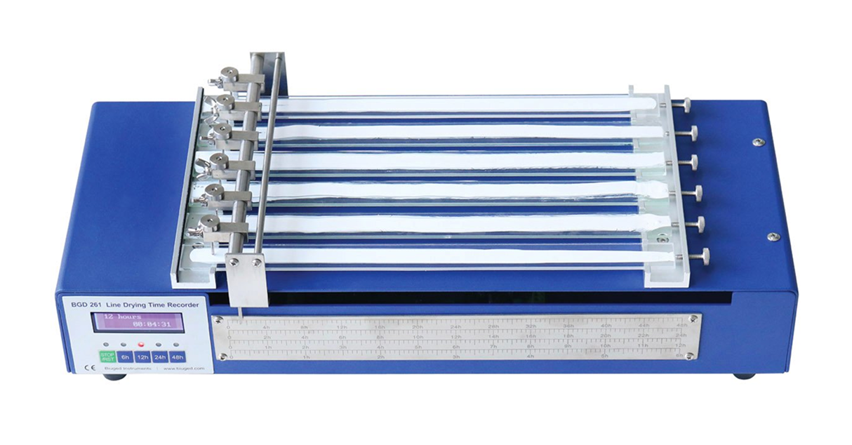 A Biuged oferece um Medidor de Tempo de Secagem versátil para ajudar a quantificar as várias etapas da cura e secagem do filme, fornecer resultados reproduzíveis e garantir a mais alta eficiência. Este aparelho é capaz de testar com precisão o tempo de secagem ou o comportamento de gelificação de tintas e revestimentos.