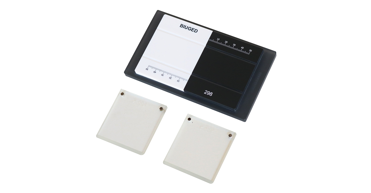 O Criptômetro Pfund Poder de Cobertura Preto e Branco é um instrumento que consiste em uma placa de vidro, metade preta e metade branca como base.